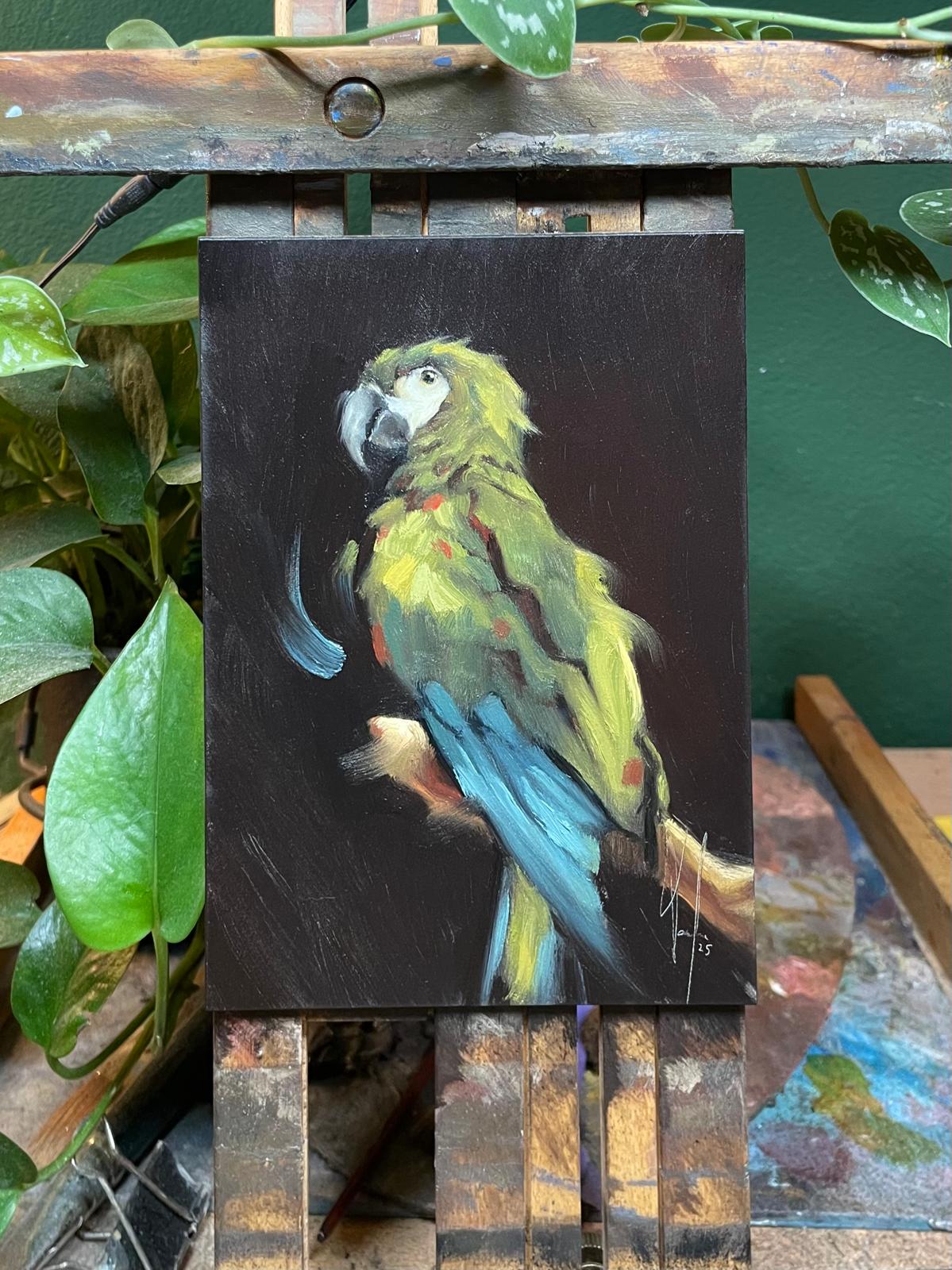 This small portrait of a Blue-winged Macaw is hand-painted in oil on gessoboard, sized 13 x 18 cm (5.1 x 7.1 inches). The painting is created using the alla prima technique, which means it was painted wet-on-wet in a single session, giving it a fresh, loose, and expressive look with visible brushstrokes! The dark background highlights the parrot’s bright green and blue feathers.