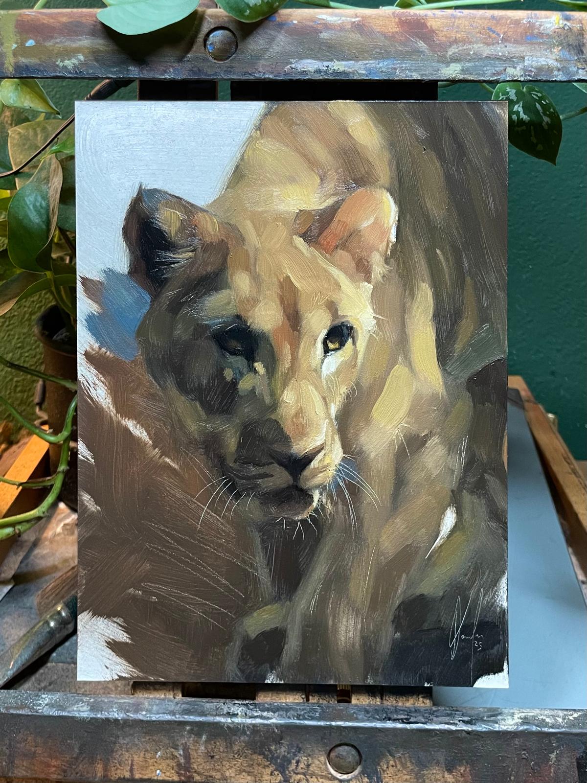 This portrait of a lioness is hand-painted in oil on gessoboard, sized 18 x 24 cm (7.1 x 9.4 inches). The painting is created using the alla prima technique, which means it was painted wet-on-wet in a single session, giving it a fresh, loose, and expressive look with visible brushstrokes.